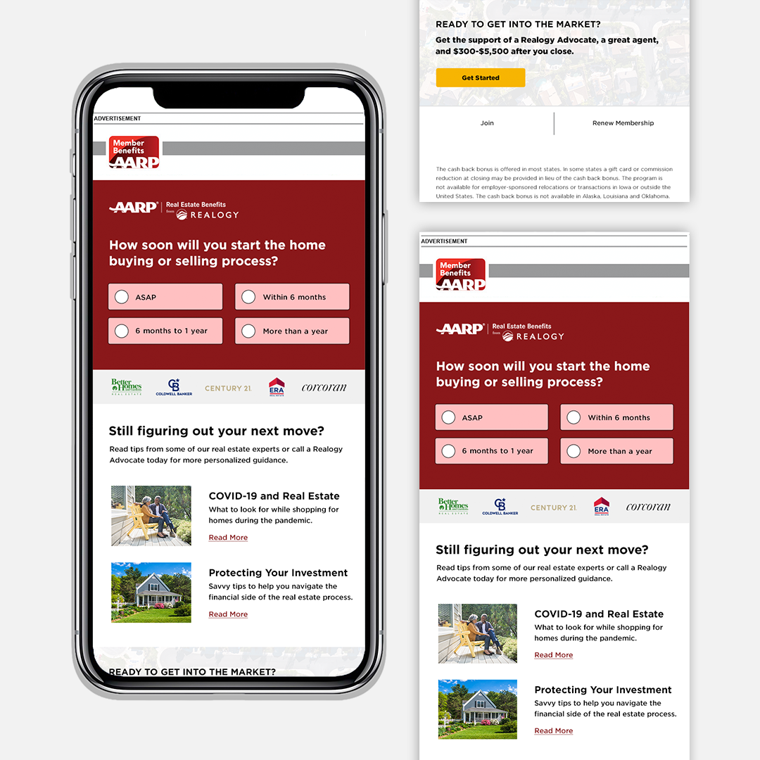 AARP Real Estate Benefits is a program for AARP members where they can earn cash benefits when they buy and/or sell their home using a local real estate agent from Realogy. As Creative Lead, I’ve had the pleasure of helping them expand beyond paid social campaigns by growing their digital presence to email design and paid media campaigns that run on various platforms.