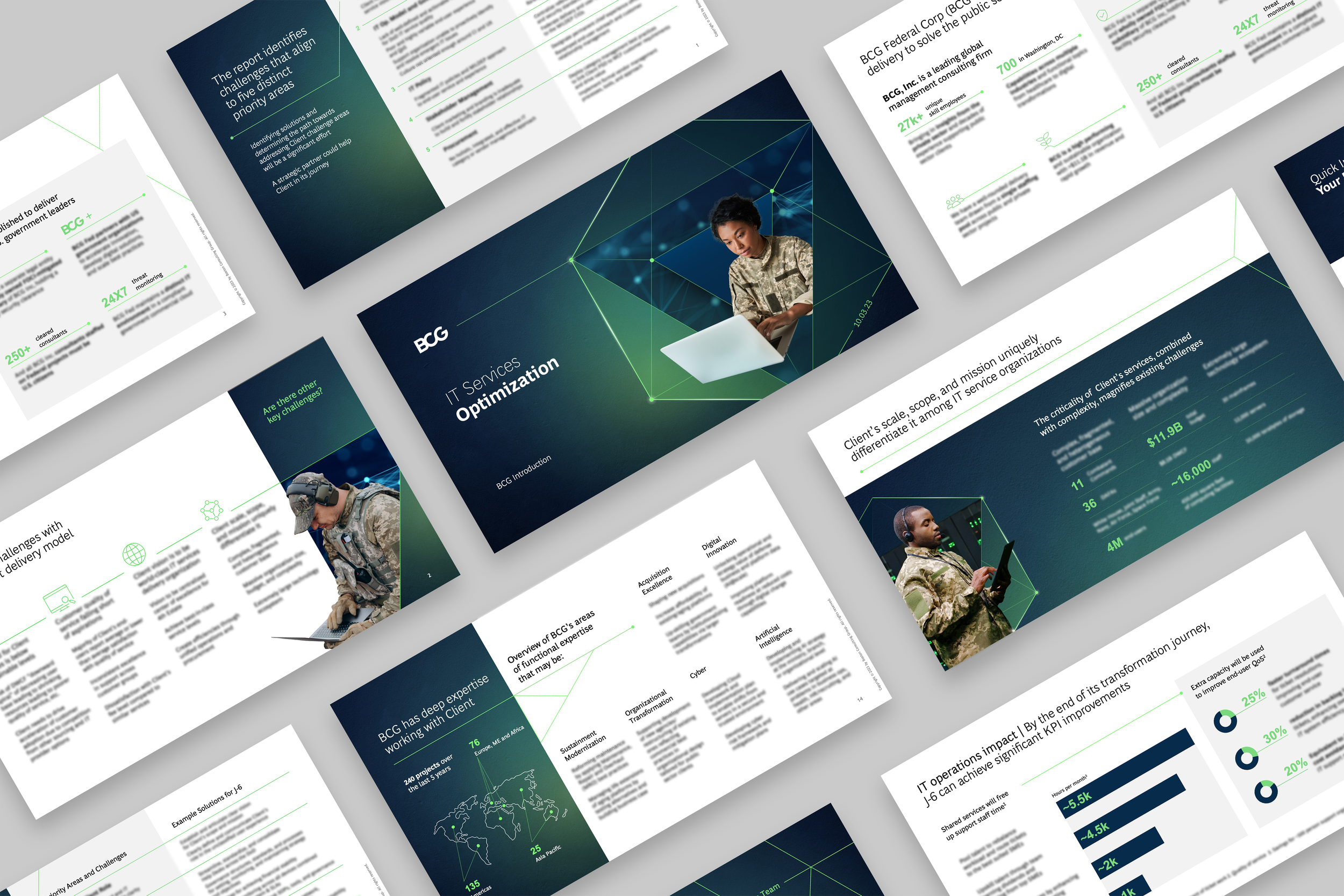 The BCG Federal case team engaged Design Studios to create a distinctive, modern presentation deck for a competitive IT optimization proposal. The request required balancing government formality with creative, user-centered storytelling while clearly differentiating BCG from competitors. In addition to the core deck, a digital one-pager illustration was requested to visually reinforce themes of optimization, connectivity, and transformation.